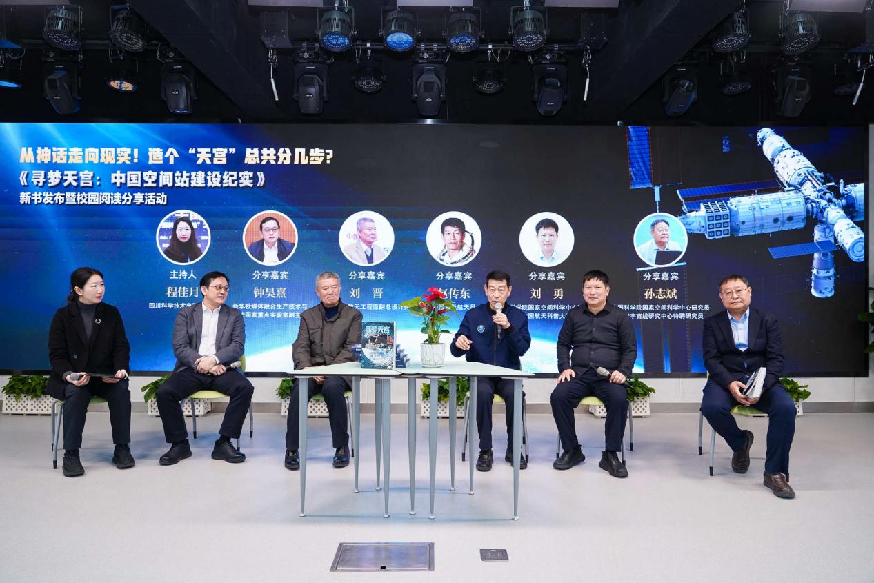 中国出版协会理事长邬书林,中国出版协会副理事长兼中国图书评论学会会长郭义强,中国载人航天工程原副总设计师刘晋,首批航天员赵传东,新华社国家重点实验室副主任钟昊熹,中国科学院国家空间科学中心研究员、中国航天科普大使刘勇,中国科学院国家空间科学中心系统室空间实验技术室副主任、研究员孙志斌,新华文轩总经理李强,四川科学技术出版社社长程佳月等嘉宾出席。在全体嘉宾和师生的共同见证下,邬书林、郭义强等七位嘉宾携手按下启动手印,正式发布《寻梦天宫:中国空间站建设纪实》。