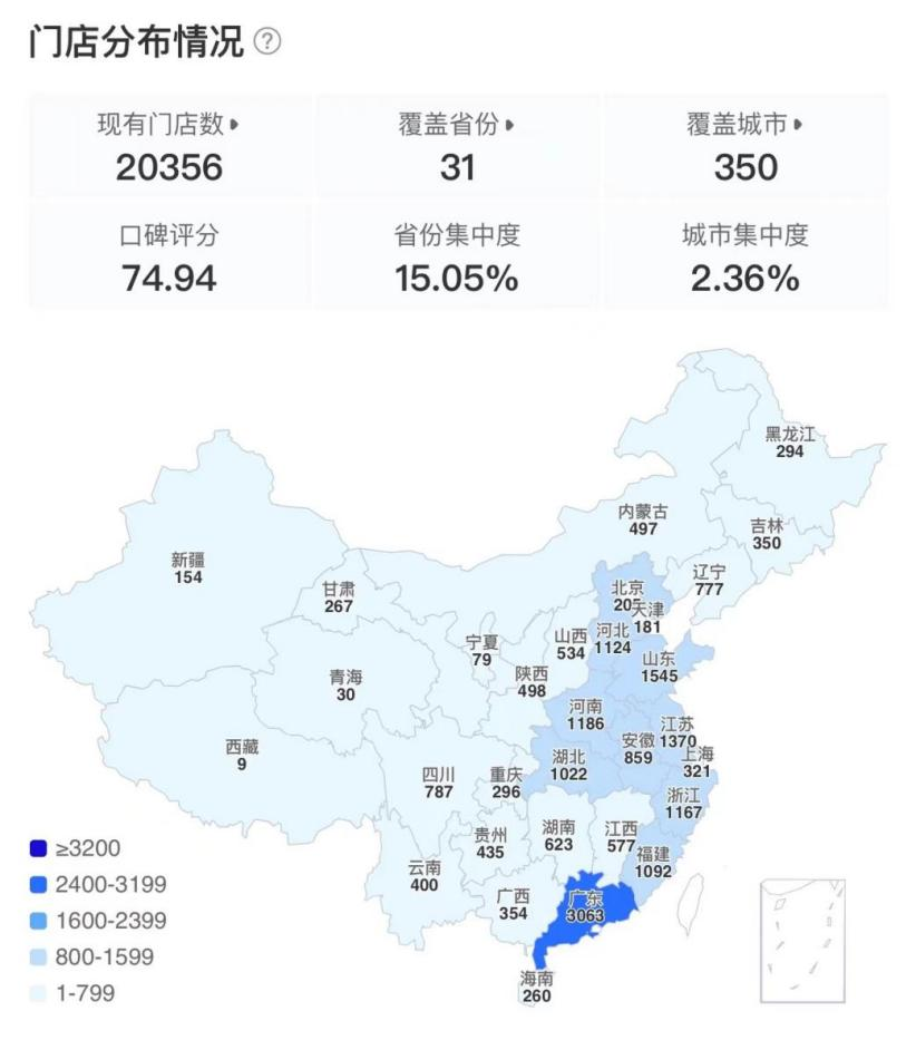 截止2024年6月28日,华莱士国内门店数及分布。图源:窄门餐眼