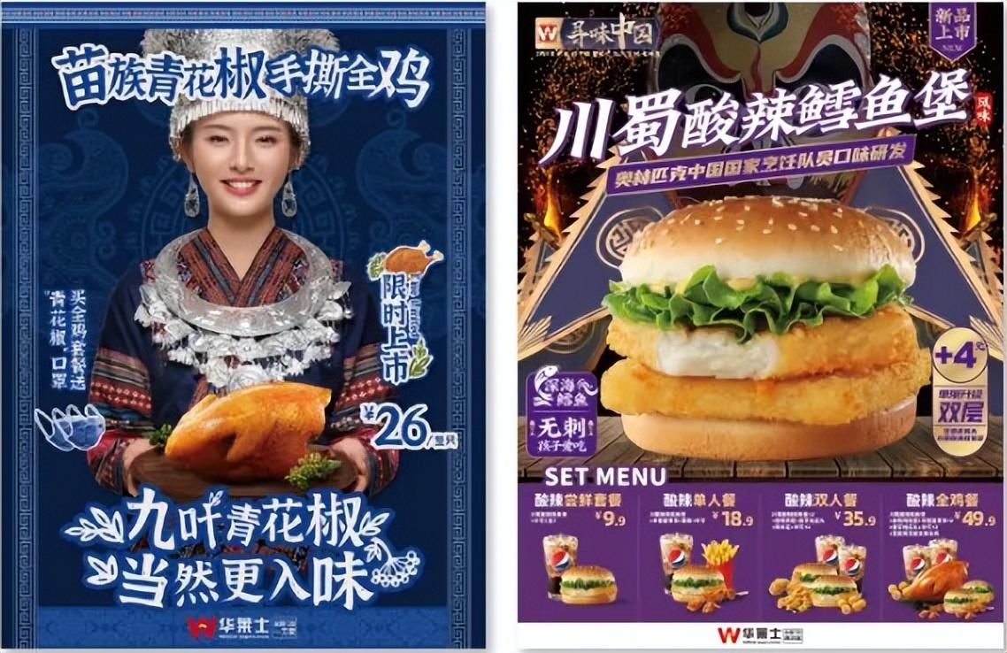 在产品层面,华莱士从单纯的炸鸡汉堡转向“全鸡汉堡”的差异化创新,打出“全鸡配汉堡,华莱士吃好”的口号,并推出苗族青花椒鸡、川蜀酸辣鱼堡等地域化特色产品。